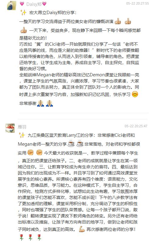 本次培訓以老師(shī)學習(xí)成長爲主的(de)翻轉課堂,老師(shī)們全程都(dōu)在參與,自主學習(xí)、合作學習(xí)、探究學習(xí),師(shī)評、自評、互評,高(gāo)效翻轉課堂體現的(de)淋漓盡緻!期待更多的(de)老師(shī)能(néng)夠在自己的(de)課堂實現翻轉式高(gāo)效課堂,将英語學科核心素養融入課程,培養高(gāo)能(néng)高(gāo)分(fēn)的(de)人(rén)才。