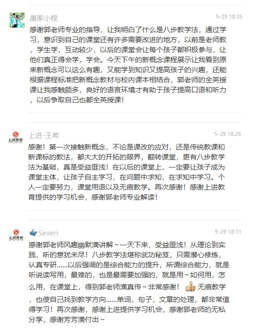 本次培訓主要就是能(néng)夠讓老師(shī)們轉變教學模式,以學生爲主體,讓學生做課堂的(de)真正主人(rén)。讓他(tā)們體驗到(dào)學習(xí)的(de)快樂(yuè)。其次,就是把難的(de)知識簡單化,把詞彙、語法情景化,更貼近生活,加深記憶。教學相(xiàng)長,用(yòng)八部教學法操控課堂流程,達到(dào)全英授課。