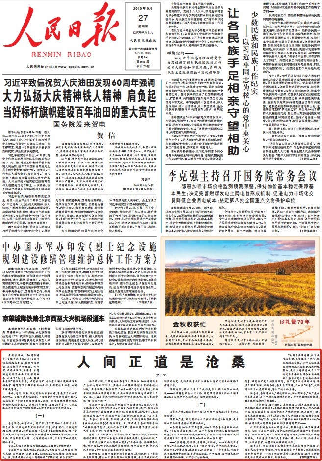 新中國成立70周年之際,人(rén)民(mín)日報從26日起連續刊發三篇“宣言”署名文(wén)章(zhāng)。今天刊發第二篇《人(rén)間正道是滄桑》。