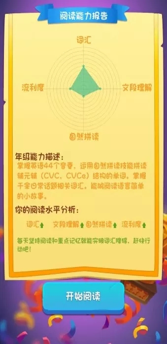 每本圖書(shū)後,都(dōu)配套語音(yīn)和(hé)閱讀(dú)理(lǐ)解練習(xí),幫助孩子提升語音(yīn)和(hé)閱讀(dú)理(lǐ)解能(néng)力,詳盡的(de)閱讀(dú)報告幫助孩子更好地(dì)了解自己的(de)語音(yīn)和(hé)閱讀(dú)水(shuǐ)平。