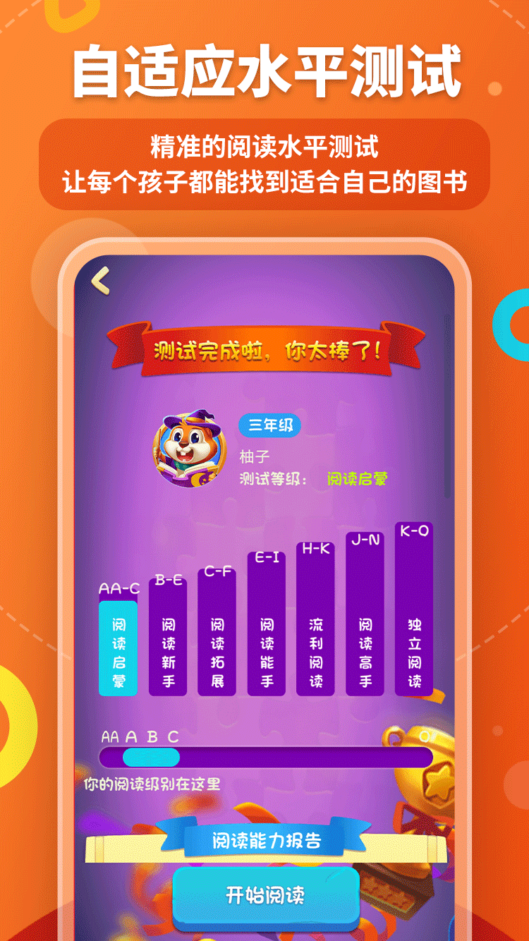孩子在初次使用(yòng)讀(dú)伴兒美(měi)式分(fēn)級閱讀(dú)時,會(huì)做一套自适應的(de)英語水(shuǐ)平測試,每個(gè)孩子都(dōu)能(néng)夠根據測試結果,找到(dào)适合自己閱讀(dú)水(shuǐ)平的(de)圖書(shū)。