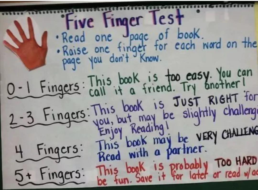 如(rú)果這一頁所有(yǒu)的(de)單詞都(dōu)認識,這本書(shū)可(kě)能(néng)太簡單了;如(rú)果有(yǒu)超過5個(gè)單詞不認識,這本書(shū)可(kě)能(néng)太難了;如(rú)果隻有(yǒu)2-3個(gè)單詞不認識,但(dàn)是可(kě)以根據上(shàng)下文(wén)猜一猜,不影響對内容的(de)理(lǐ)解,這本書(shū)就是一本Just Right Book,正合适的(de)書(shū)!